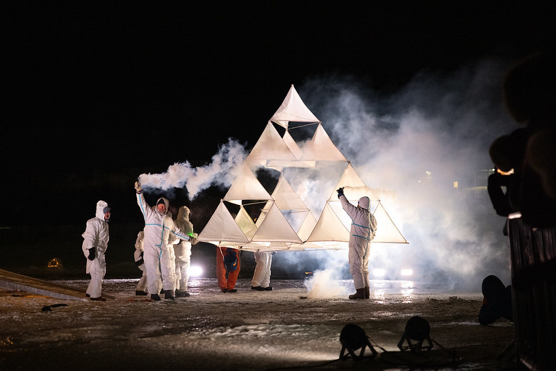Når et par tusinde mennesker klapper med deres tykke vanter i minus 30 grader, lyder det som den blødeste techno. Den arktiske kulde i Kirkenes, 400 km nord for Polarcirklen og et stenkast fra grænsen til Rusland og Finland, stjæler alle lyde. Vi står ved en indsø i udkanten af den lille nordnorske by og kigger ned på en interimistisk scene ude på isen, hvor performere i hvide dragter er ved at bygge en drage. Lokale hornmusikere spiller, og skuespillere fra Rusland, Ukraine og Ungarn slår stænger ned i gulvet og kommer med ritualistiske udråb.