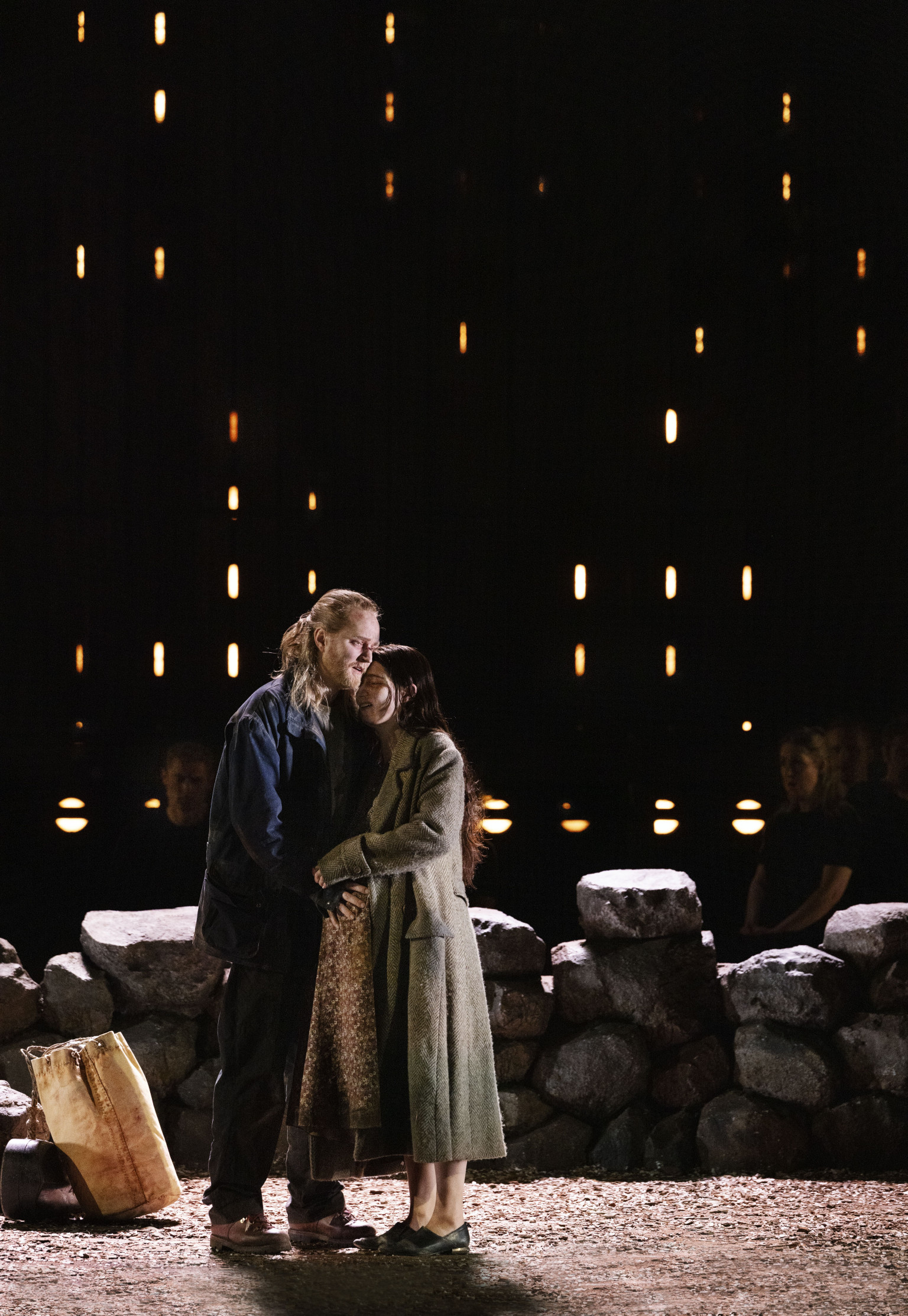 Sørensen has no problems holding all these shards in the air – floating them on clouds of orchestral sound neither vaporous nor cadaverous. He elevates the text given to him by the Nobel laureate like the finest of opera composers: every word is lucid, given the sonic oxygen and narrative import it needs. Musical characterisation is strong from the moment Asle and Alida trudge onto the stage: his music is lyrical and optimistic; hers neurotic, pained. But Sofia Adrian Jupither’s production has no idea what to do with them, and they are plonked downstage for almost the entirety of the performance. Their tormentors have to travel to them.