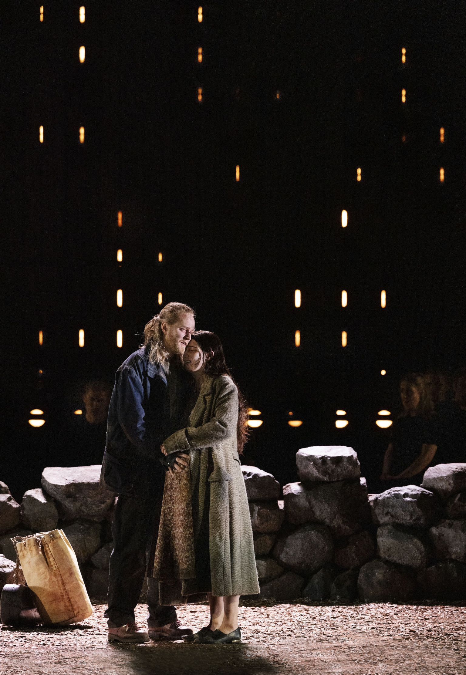Sørensen har ingen problemer med at holde disse skår i luften – svævende på skyer af orkesterklang, der hverken er æterisk eller død. Han løfter teksten fra Nobelpristageren som den fineste operakomponist: hvert ord er klart, får den nødvendige lydlige ilt og narrative vægt. Den musikalske karakterisering er stærk fra det øjeblik, Asle og Alida træder ind: Hans musik er lyrisk og optimistisk; hendes neurotisk, smertefuld. Men Sofia Adrian Jupithers iscenesættelse ved ikke, hvad den skal stille op med dem, og de bliver nærmest plantet midt for scenen hele forestillingen igennem. Deres plageånder må bevæge sig hen til dem.