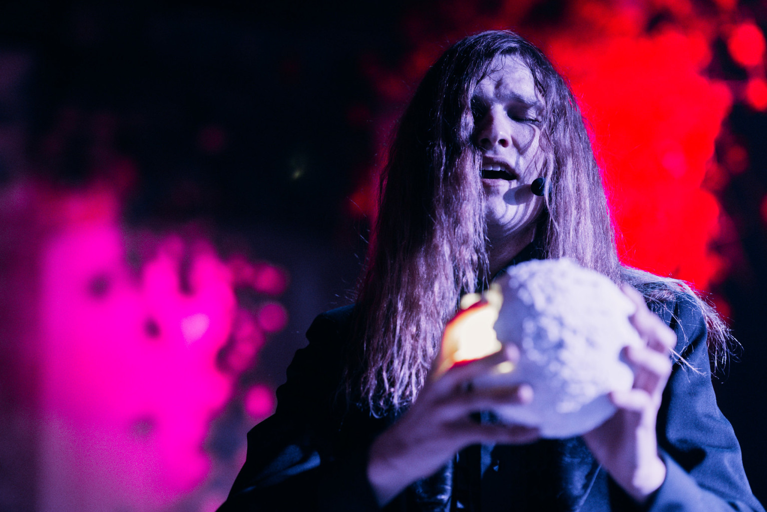 Han spiller forvrænget violin, bevæger sig ud blandt publikum med en lysende kokosnødlignende kugle og beder en bøn