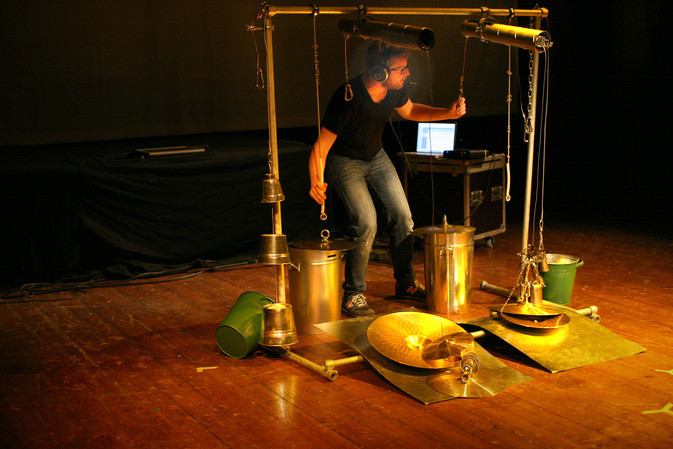 ”I et af mine værker indgår et stort rør, som jeg ruller hen ad gulvet med foden, og i hver ende af røret er der to gevindstænger. I første og anden sats bliver der sat nogle skiver og nogle VVS-ting på hver stang, og i tredje sats lægger jeg så røret ned på gulvet, så det siger uuhhhwissszzz. Samtidig står jeg med to låg, som røret rammer, når jeg slår ud med armene – det hele minder om en mekanisk legetøjsabe, der slår to bækkener mod hinanden. Den del er ikke skrevet ned, jeg ved bare, at det er det, jeg skal gøre, men de to andre i bandet spiller noget på samme tid, som er skrevet ned.”