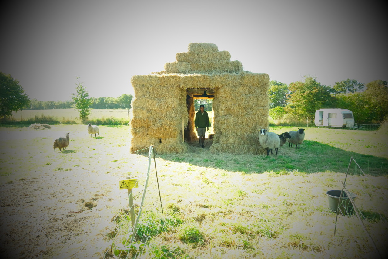 Later he sits on a straw bale in the straw castle, while his father’s recordings of French sheep resound across the fields