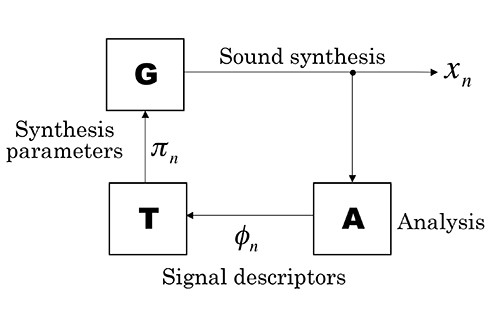 The signal generator is an oscillator or some compound synthesis model that generates an audio signal \(x_{n}\) which depends on the synthesis parameters \(pi_{n}\), where \(n=0,1,2,\ldots\) is the time. The signal \(x_{n}\) is split and written to a sound file (or sent through the sound card to loudspeakers), and it is also fed into the analysis module. The purpose of the analysis module is to get access to various signal descriptors that relate to perceptual features (Peeters et al., 2011) such as the fundamental frequency, spectral centroid, amplitude, degree of noisiness, etc. The analysis module has access to some segment of the recently generated signal, say, the last L samples, and it outputs a stream of signal descriptors \(phi_{n}\). For simplicity we may assume that the signal descriptors are generated at the audio sampling rate. Then the analysis module is a function